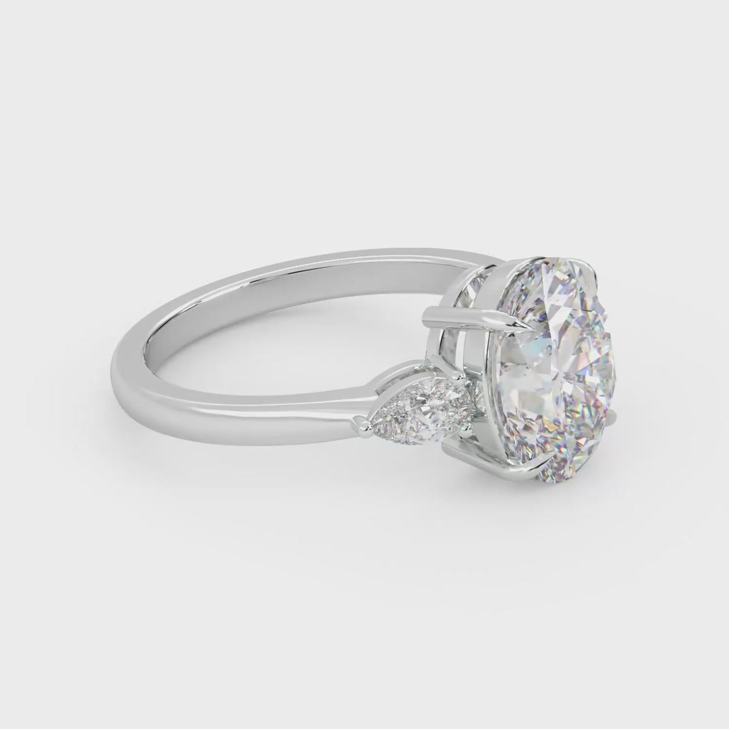 At the center sits a stunning oval-cut stone, chosen for its brilliance and elongated silhouette that flatters the hand beautifully. Framed by pear-shaped side stones, this classic three-stone design symbolizes the past, present, and future — making Arvena a meaningful choice for engagements and life-changing moments.