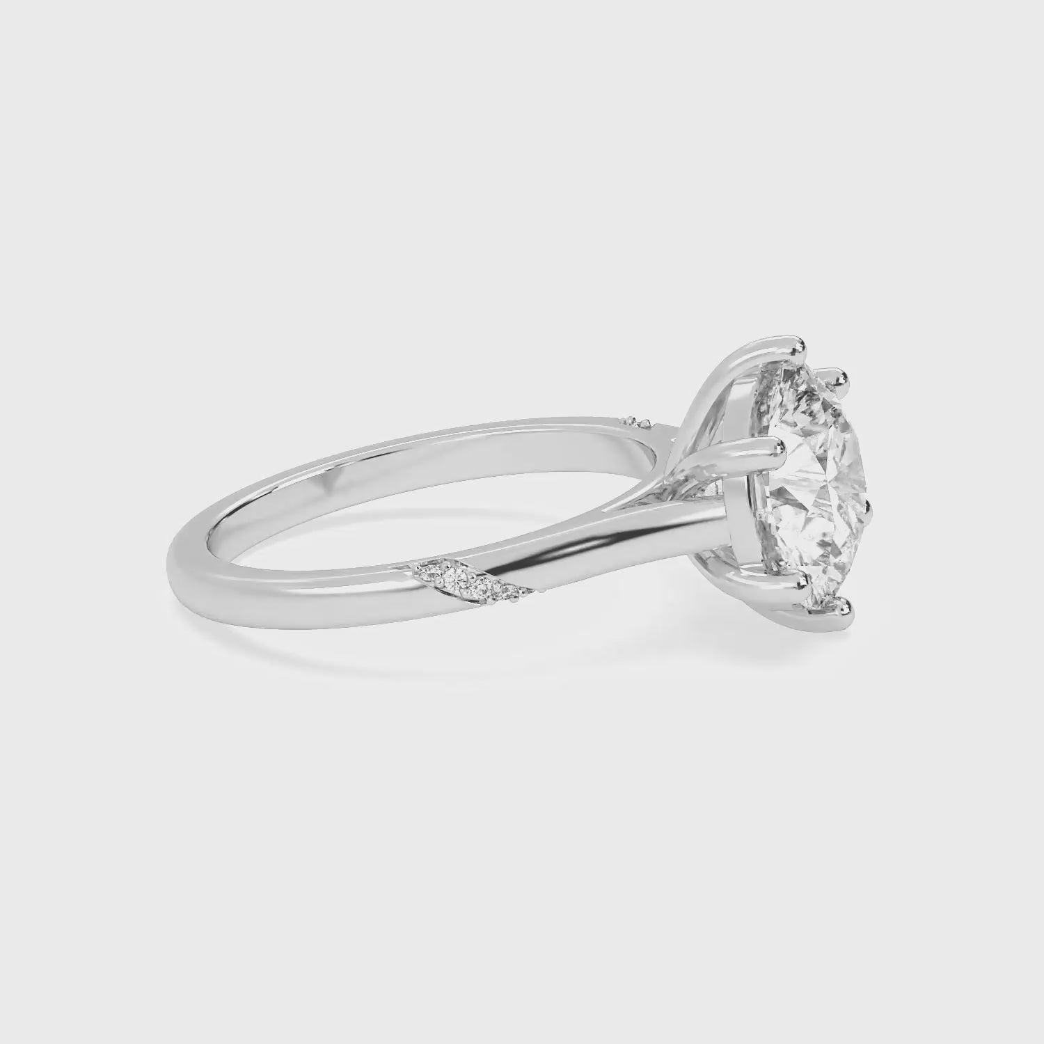 The Eiryana Engagement Ring features a brilliant round center stone set in a refined solitaire design, accented with subtle side diamonds along gently contoured shoulders. The elegant curve of the band creates a soft, flowing silhouette that enhances brilliance without overpowering the center stone.