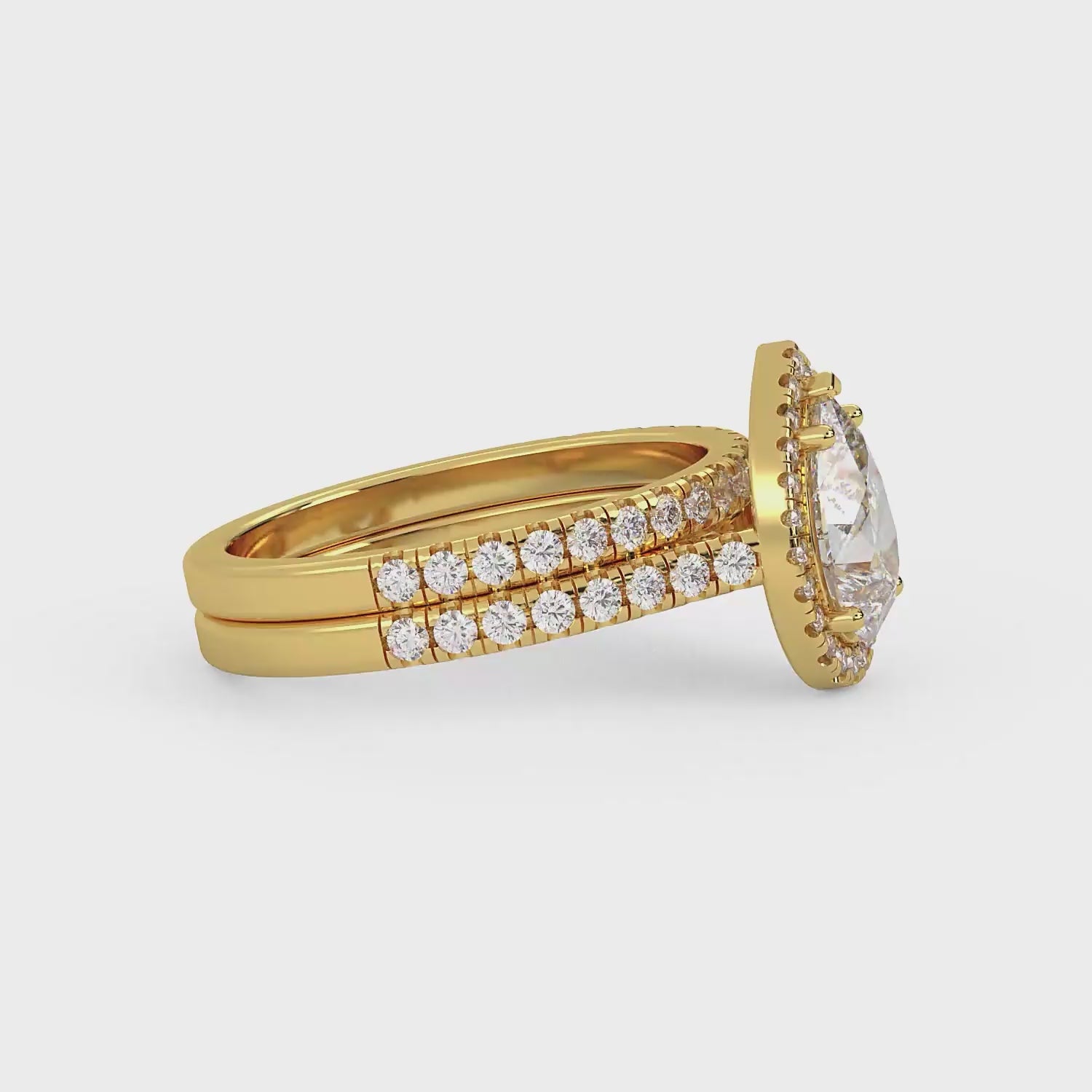 Introducing the ELYSYN™ Wedding Set, a romantic bridal pairing featuring a pear-cut halo engagement ring and a matching pavé wedding band, crafted as two separate rings designed to sit beautifully together.